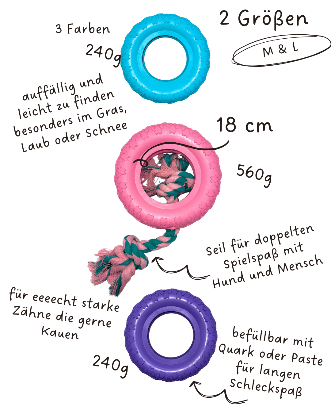 - Größe L: In Rosa mit Seil, für größere Hunde und für interaktive Spiele.