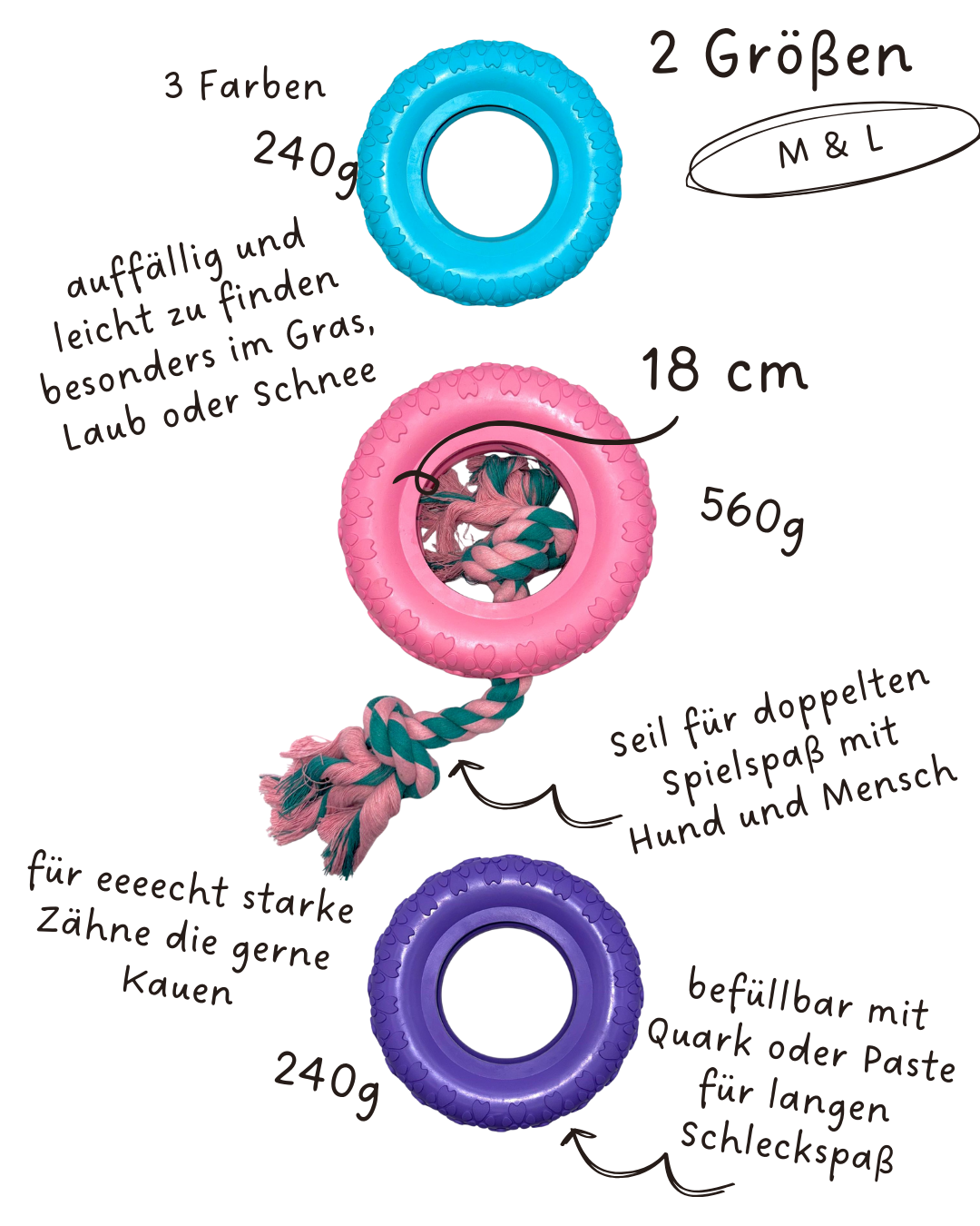 • Größe L: In Rosa mit Seil, für größere Hunde und für interaktive Spiele.